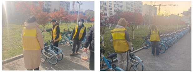 自11月25日开始,由24级中医学班同学组成的校园美化秩序小队开启了维护共享单车停放秩序的劳育活动。在小队成员每日三个时段的轮流负责、耐心引导下,校园道路越发畅通,宿管压力日益减轻,收获了来自宿管阿姨和同学们的一致好评。